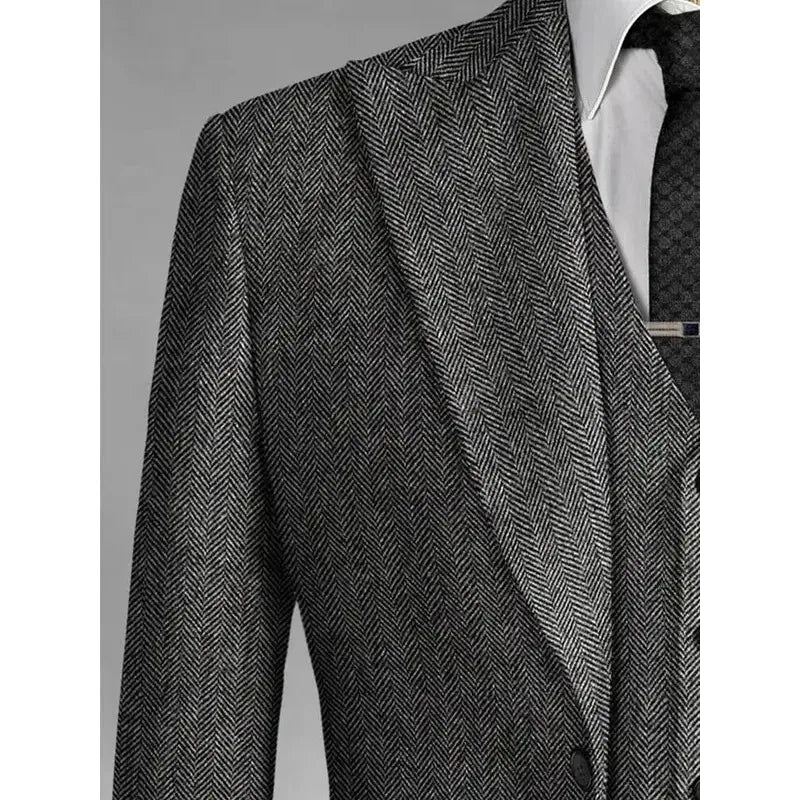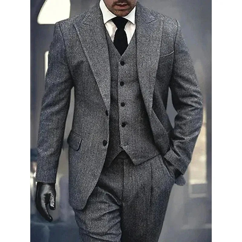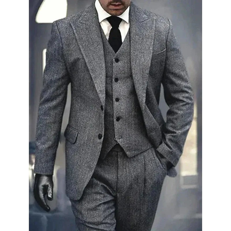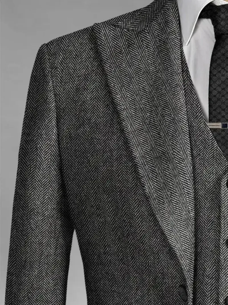 3 Pieces Men's Grey Herringbone Suits Formal Slim Fit Peak Lapel Tweed Prom Tuxedos for Wedding Groomsmen (Blazer+Vest+Pants)