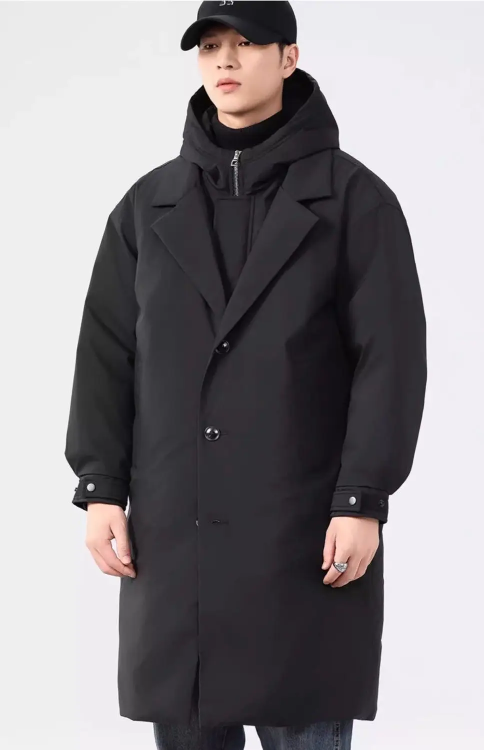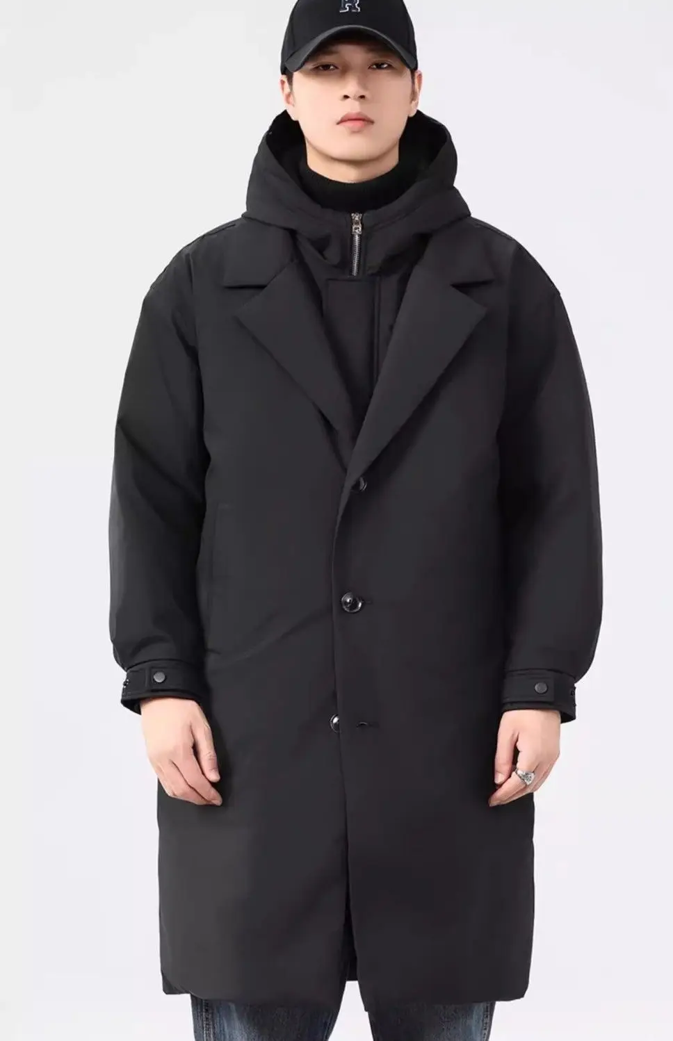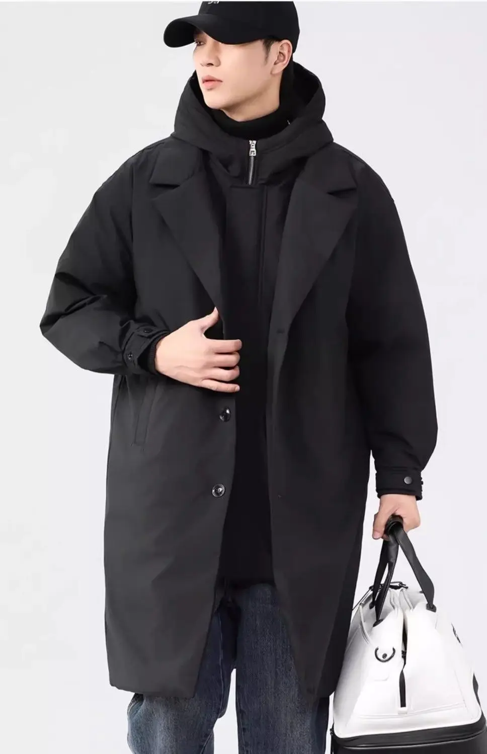 Man Windbreaker Winter Thicken Windproof Warm Hooded Men Down Coat Vintage Mid Length Long Sleeve Male Fake Two-piece Outerwear