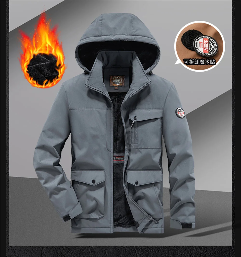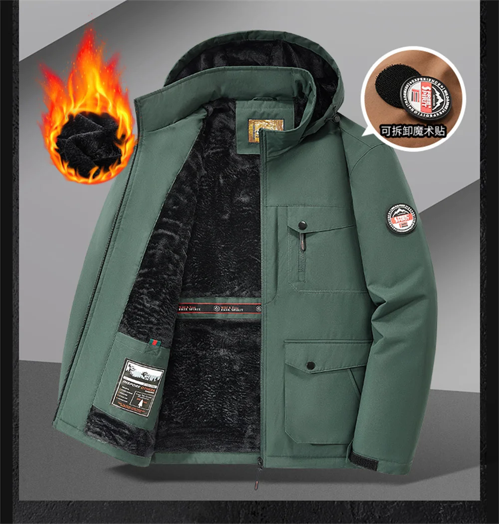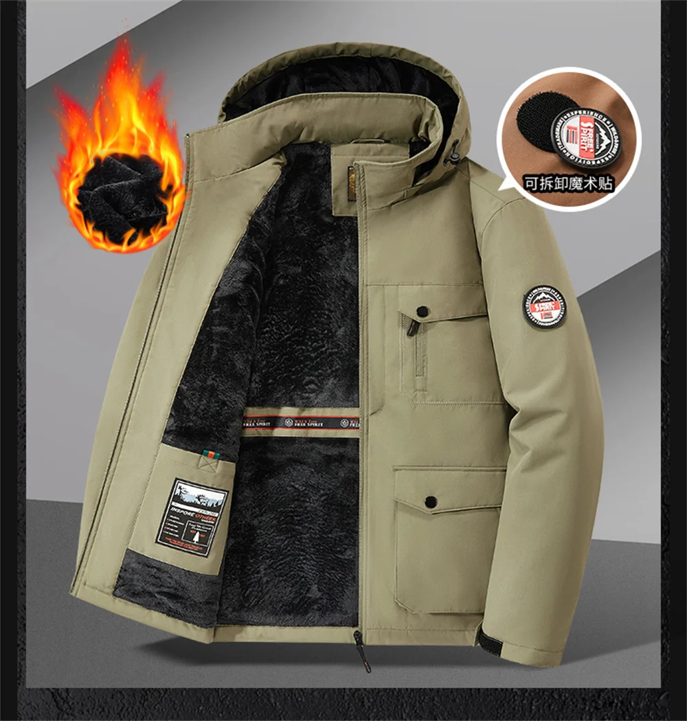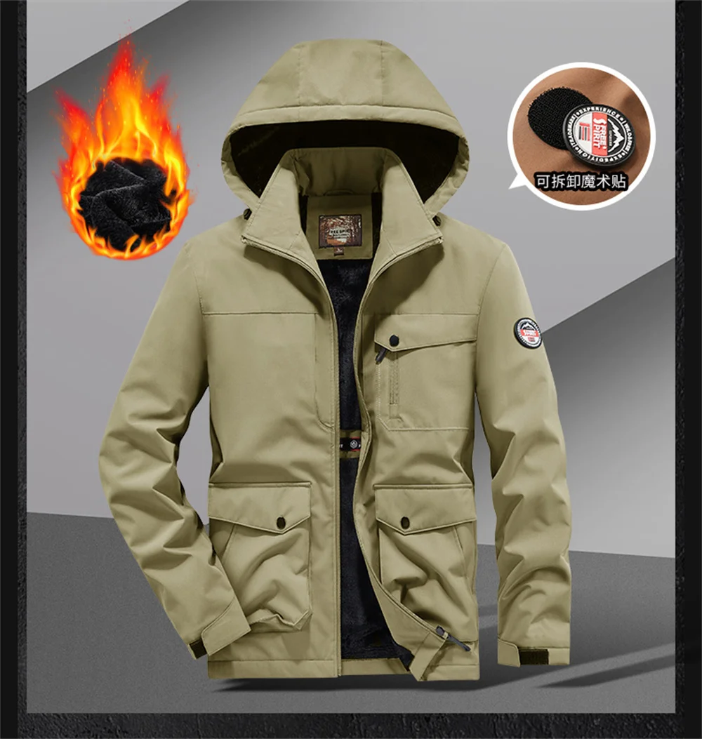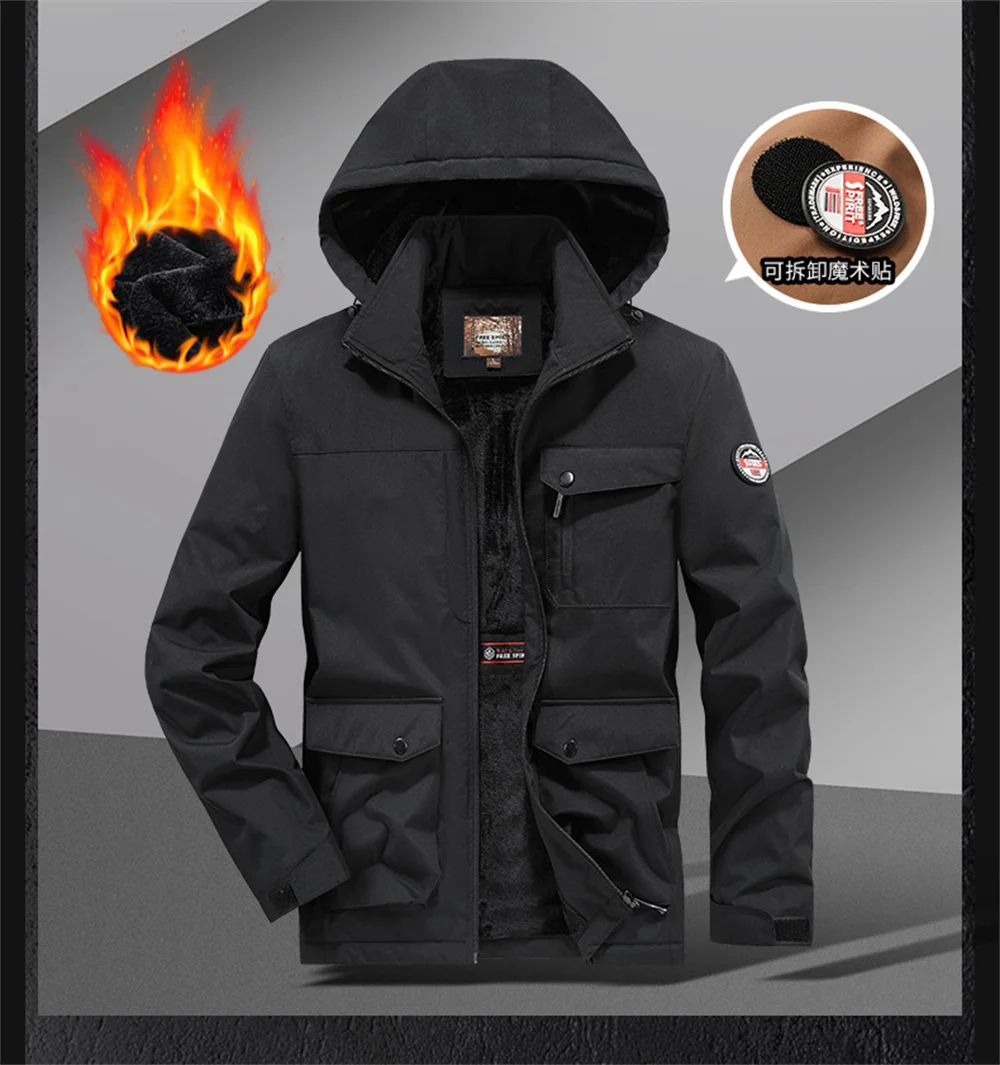 Winter New Arrival Men's Detachable Hood Fleece-Lined Jacket Casual Fashion Windproof Warm Multi-Pocket Jacket Workwear Jacket